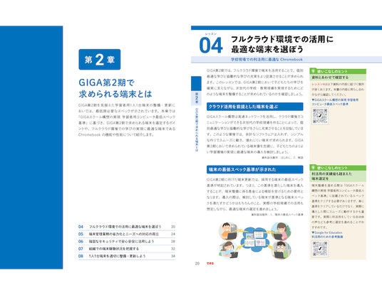 本書では、多岐にわたる『最低スペック基準』の内容をカテゴリごとにまとめてわかりやすく掲載。GIGA第2期に最適な端末を選定するためのポイントや、Google for Education の利活用事例と合わせてご覧いただけるため、基準を満たした端末の導入による「次世代の学校・教育現場」のICT利活用環境を明確にイメージしていただけます。