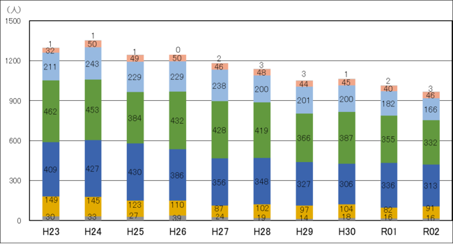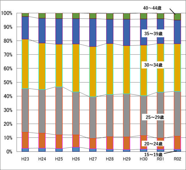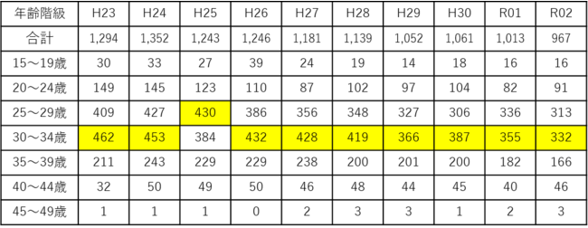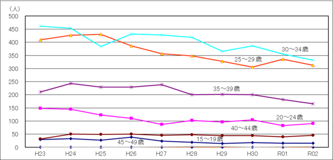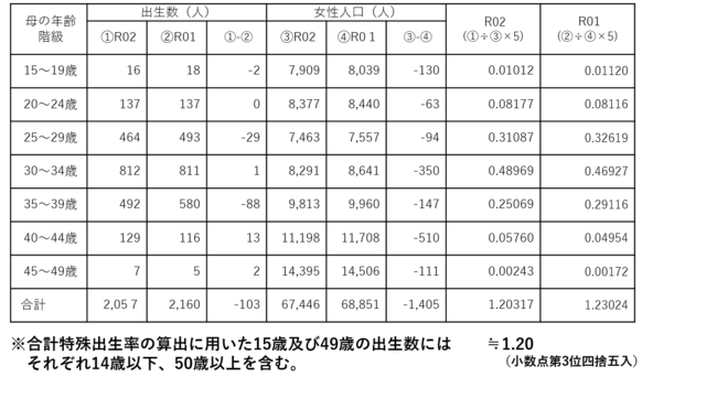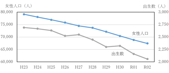女性人口(15歳~49歳)が67,446人(令和元年68,851人)で前年より1,405人減少しており、出生数は2,057人(令和元年2,160人、前年比103人減)で、年齢別では35~39歳の年齢階級で大きく減少した。