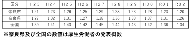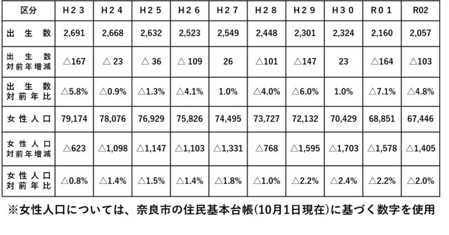 これは、奈良市で出産する方は全国的な傾向と同じく減少しているものの、子育て世帯のニーズを把握し実行してきた本市の施策が、一定評価されたものと考えられます。引き続き、子育て世帯のニーズを分析し、第2子、第3子と産み育てやすい子育て環境の充実を図ります。