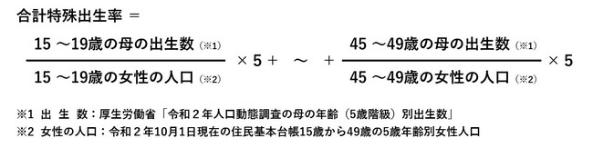合計特殊出生率とは、女性が出産可能な年齢を15歳~49歳と定義し、それぞれの出生率を出し、足し合わせることで人口構成の偏りを排除し、一人の女性が一生に産む子供の平均数を示したものです。