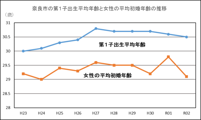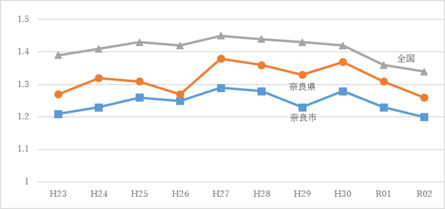 本市の令和2年の合計特殊出生率が、昨年の1.23ポイントから0.03ポイント減少し、1.20ポイントとなりました。合計特殊出生率は全国で減少しており、1.34(前年比0.02ポイント減)、奈良県においても減少しており、1.26(前年比0.05ポイント減)となっています。