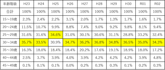 母の年齢(5歳階級)別第1子出生数の構成比率推移