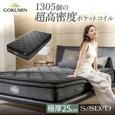 極厚25cm、体圧分散に優れた高耐久のポケットコイルマットレスです。超高密度1669個からなる2層のポケットコイルが、身体を点で支えさらに下層へ分散。コイルを感じない静音性とストレスフリーな寝返り、圧迫感の無い寝心地をご体感頂けます。GOKUMINだから実現できた高耐久なクッション材を使用。4層重ねにより絶妙なバランスの極上寝心地へ。中綿は高弾力のフランス産羊毛を贅沢に採用しました。