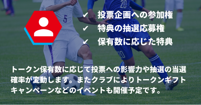 クラブトークンはチームへの応援の「しるし」や「証」の役割を果たし、また単に支援の証になるだけでなく、保有することでクラブ発の投票企画への参加や、トークン保有者限定の特典への応募ができるなど、新しい体験ができるデジタル上のアイテムです。