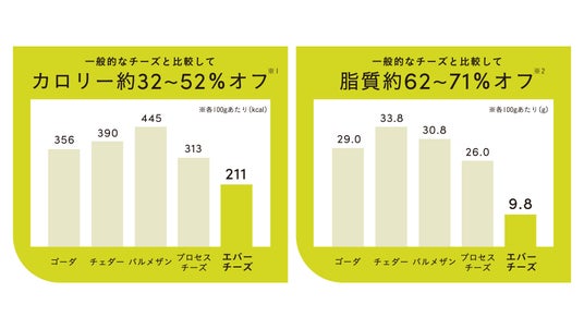 さらに、「Ever Cheese」は、栄養成分にも特徴があります。一般的なチーズと比較してカロリー約32~52%オフ※1、脂質約62~71%オフ※2、また、コレステロールはゼロです。チーズを食べるうえで、気になる要素をオフすることができています。