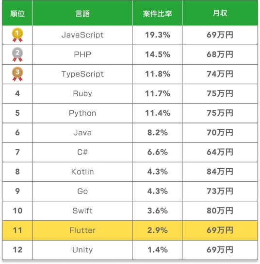 Flutterは現在のIT市場において一定の存在感を示しており、全案件に対する比率は2.9%となっています。この数字により、Flutter関連の案件は案件数ランキングで11位に位置づけられています。比率だけを見ると小さく感じられるかもしれませんが、多様なプログラミング言語やフレームワークが乱立する市場においてトップ11に入っていることは、Flutterが着実に市場での地位を確立していることを示しています。クロスプラットフォーム開発ツールとしての需要が反映された結果と言えるでしょう。