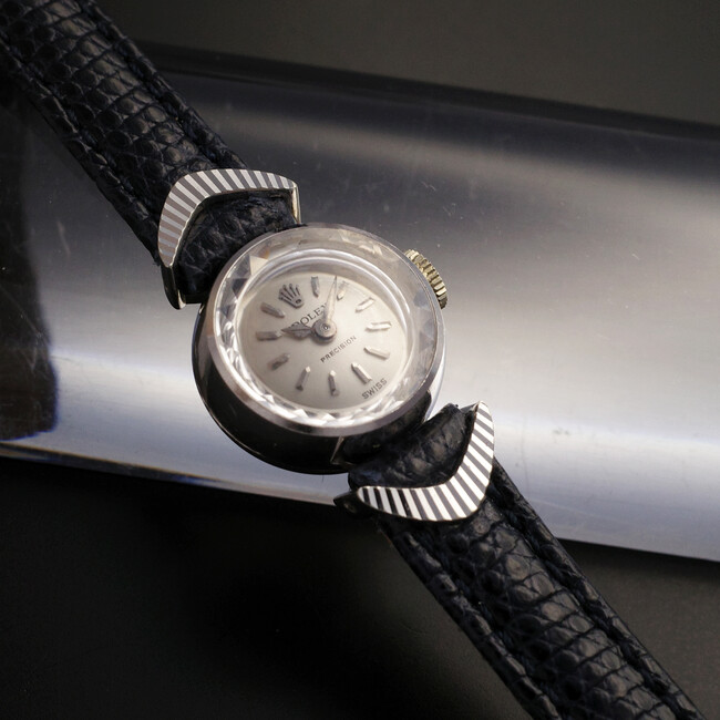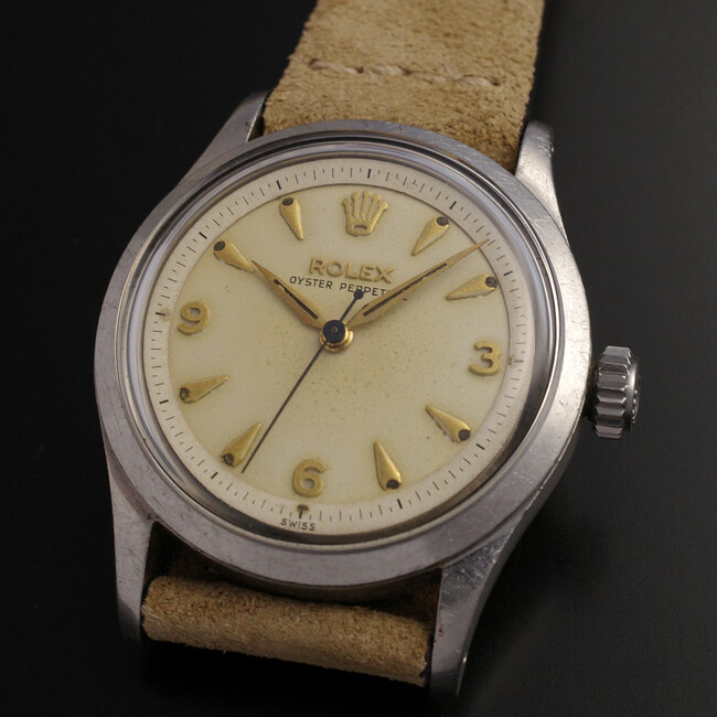 スタンダードの”バブルバック”よりやや大きめで着用時の存在感が特徴の“セミバブルバック”は、製造期間も短く、現在では良いコンディションのものが見つかりにくいため希少な一本。ダイヤルは3・6・9のアラビア数字にクサビインデックスとアルファ針に、ブルースティールの秒針とこの時代ならではの組合せとなっています。