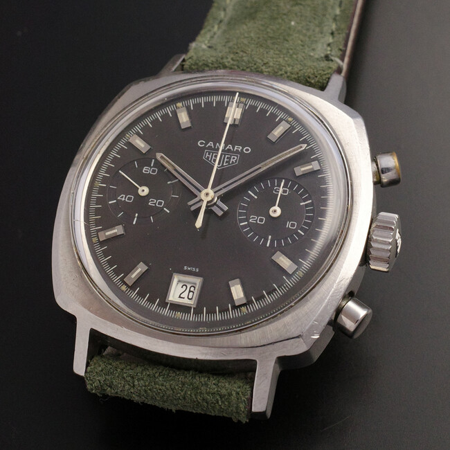 シンプルなグレーのダイヤルにホワイトのクロノ針とインデックスの“カマロ”は、シーンを選ばずお使いいただける上品な佇まいが特徴。文字盤のグレーも僅かにブラウンがかった深みのあるニュアンスで、カラフルで派手なデザインの多い1970年代のモータースポーツ系ウォッチにおいては貴重な一本です。