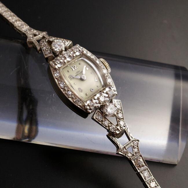 ケース周りとブレスレットのダイヤモンドが煌めく“レディ ハミルトン”。隅々までダイヤモンドをあしらった華やぎあるデザインが、アメリカンウォッチらしい一本です。ジュエリーとしてもお楽しみいただけます。