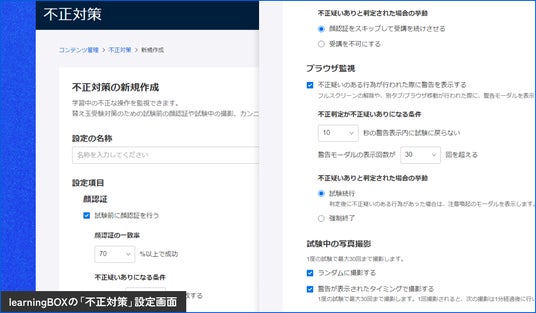 learningBOX株式会社(本社:兵庫県たつの市、代表取締役:西村 洋一郎)は、2024年6月末(予定)に、eラーニングシステム「learningBOX」(ラーニングボックス)において、「なりすまし受験」「カンニング」の不正対策など、IBT・CBT試験の実施・運用に関わる機能拡充を実施いたします。