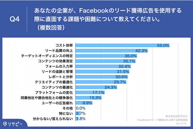 「Q4.あなたの企業が、Facebookのリード獲得広告を使用する際に直面する課題や困難について教えてください。(複数回答)」(n=111)と質問したところ、「コスト効率」が55.0%、「リード品質の向上」が42.3%、「ターゲットオーディエンスの特定」が36.0%という回答となりました。