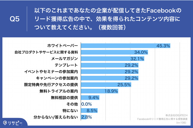 Q4で「特にない」「分からない/答えられない」以外を回答した方に、「Q5.以下のこれまであなたの企業が配信してきたFacebookのリード獲得広告の中で、効果を得られたコンテンツ内容について教えてください。(複数回答)」(n=106)と質問したところ、「ホワイトペーパー」が45.3%、「自社プロダクトやサービスに関する資料」が34.0%、「メールマガジン」が32.1%という回答となりました。