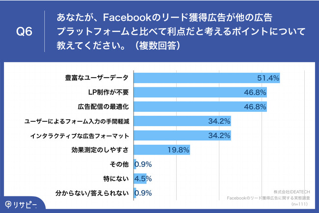 「Q6.あなたが、Facebookのリード獲得広告が他の広告プラットフォームと比べて利点だと考えるポイントについて教えてください。(複数回答)」(n=111)と質問したところ、「豊富なユーザーデータ」が51.4%、「LP制作が不要」が46.8%、「広告配信の最適化」が46.8%という回答となりました。