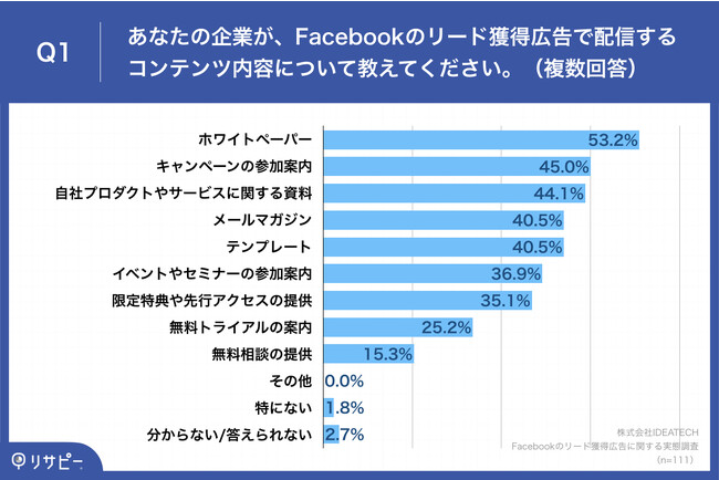 Facebookのリード獲得広告で配信するコンテンツ内容、「ホワイトペーパー」が53.2%で最多