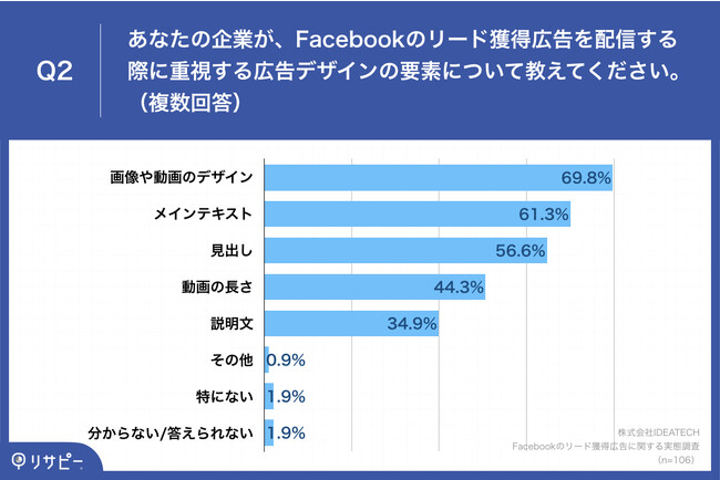 Q1で「特にない」「分からない/答えられない」以外を回答した方に、「Q2.あなたの企業が、Facebookのリード獲得広告を配信する際に重視する広告デザインの要素について教えてください。(複数回答)」(n=106)と質問したところ、「画像や動画のデザイン」が69.8%、「メインテキスト」が61.3%、「見出し」が56.6%という回答となりました。