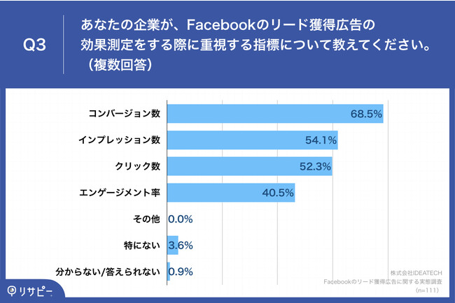 「Q3.あなたの企業が、Facebookのリード獲得広告の効果測定をする際に重視する指標について教えてください。(複数回答)」(n=111)と質問したところ、「コンバージョン数」が68.5%、「インプレッション数」が54.1%、「クリック数」が52.3%という回答となりました。