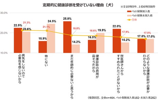 健康診断を受診しない理由について尋ねたところ、「病気をしないので必要性を感じないから」(21.3%)、「特にない」(21.1%)、「まだ年齢的に必要ないと思うから」(18.8%)、「健康診断の費用が高そうだから」(18.6%)、などが上位を占めており、金銭的な負担もさることながら、ペットの年齢や健康状態を踏まえて不要と判断されている方が多いようです。