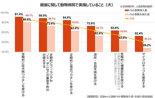 設問への回答結果をペット保険加入者と未加入者に分けて確認すると、総じてペット保険加入者の実施率が高く、未加入者の実施率と比べると約10~20%もの乖離が生じていました。保険会社によって異なりますが、ワクチン接種で予防できる病気を保険支払対象外としているペット保険会社も複数存在することから、ペット保険加入時点でこうした病気への知識を得るとともに予防意識を持つ飼育者の方もいらっしゃるのではないでしょうか。