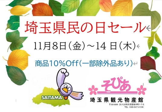 埼玉県物産観光館「そぴあ」では、11月14日(木)の県民の日の前6日間を「埼玉県民の日セール」と銘打って、埼玉を代表するおみやげ品を全品10%OFF(一部除外品もあり)で販売いたします。