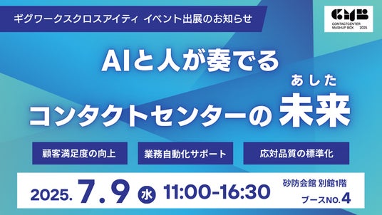 ギグワークスクロスアイティ株式会社(ギグワークス株式会社(東証スタンダード 2375)子会社 本社:東京都港区、代表取締役:小島正也、以下ギグワークスクロスアイティ)は、2025年7月9日(水)に株式会社コムデザインが開催するコンタクトセンター関係者向けイベント「ContactCenter MashUp BOX 2025(コンタクトセンター マッシュアップ ボックス 2025)」に出展し、「AIと人が奏でる、コンタクトセンターの”未来(あした)”」と題し、AI搭載型CRM「デコールCC.CRM」とコンタクトセンターがどのように変わっていくのか、それらに伴う課題やメリットについてご紹介します。