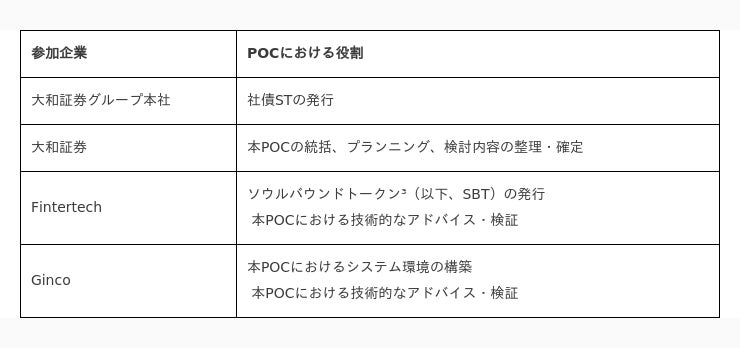 株式会社大和証券グループ本社(本社:東京都千代田区、執行役社長 中田誠司、以下「大和証券グループ本社」)、大和証券株式会社(本社:東京都千代田区、代表取締役社長 中田誠司、以下「大和証券」)、Fintertech株式会社(本社:東京都千代田区、代表取締役社長 相原一也、以下「Fintertech」)及び、株式会社Ginco(本社:東京都中央区、代表者 森川夢佑斗、以下「Ginco」)は、国内初のパブリックチェーンにおけるセキュリティトークン(以下「ST」)の発行及び、発行プラットフォームの開発に向けて、概念実証(以下「本POC」)を行いましたので、その検証結果についてご報告いたします。