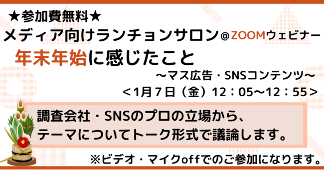 今回のメディア向けランチョンサロンでは、【レギュラーパネラー】 株式会社アダムスコミュニケーション 小池 俊明(こいけ としあき)さんとご一緒に「年末年始に感じたこと」についてお話します。ウェビナー形式での開催ですので、皆様のご都合のいい環境でのご視聴が可能です。ぜひご参加ください。