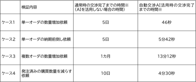 今回の実証実験では、販売側の在庫で購買側と調整可能な解が存在する場合には、自動交渉AIと販売側担当者の間で合意することができ、従来、販売側との調整・交渉にかかっていた時間を以下のように短縮することができました。