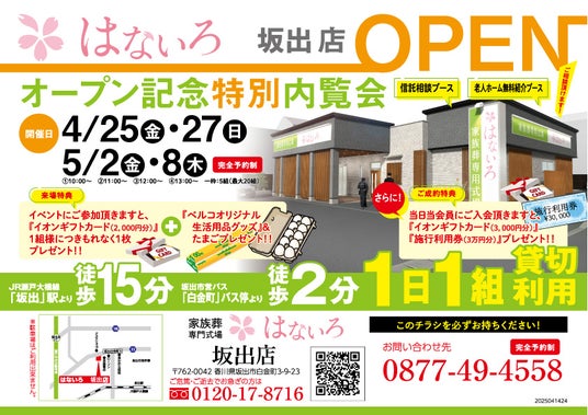 このたび冠婚葬祭の株式会社ベルコでは、香川県坂出市に**家族葬専用の新式場「はないろ坂出店」**を新たにオープンいたしました。これまでのご縁に感謝し、地域の皆様により一層寄り添ったサービスを提供することを目的に、静かであたたかな空間づくりを心がけた葬儀会館です。