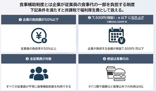 現行の「食事補助制度」は、以下の4つの条件を満たせば、福利厚生費として企業負担分を非課税とすることが可能となります。
