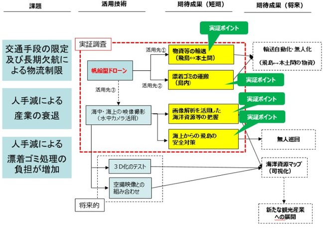 この課題を踏まえ、今年度は、海上経由での搬送の省力化と長期間の天候不順等に備えて定期船を補完し、新たな海上物資輸送手段として、無人で自律航行可能且つ風力を利用する帆船型ドローンの実用性を検証します。自然エネルギーを活用した島外からの物流サービスを実現し、令和 3 年度実証事業を更にパワーアップした、人口減少や天候不順といった環境にも柔軟に対応できる持続可能な社会システムの実現に向けたシステムの実用化をめざします。