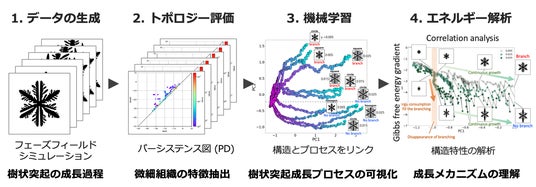 東京理科大学 先進工学部 マテリアル創成工学科の小嗣 真人教授、岡山大学の大林 一平教授、京都大学の平岡 裕章教授、筑波大学 数理物質系の三俣 千春教授らの研究グループは、トポロジーと自由エネルギーを活用した機械学習(AI)解析を実施し、薄膜結晶の電気的特性に大きな影響を与える樹枝状構造の枝分かれメカニズムを明らかにしました。これは、高品質な薄膜結晶の作製プロセスにつながる成果であり、次世代の電子デバイスへの応用が期待されます。