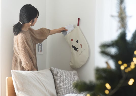描かれたイラストは、ツリーやオーナメントなどのクリスマスらしいモチーフ。落ち着いたグレイッシュカラーを使っているので、インテリアとの馴染みやすさも優秀です。
