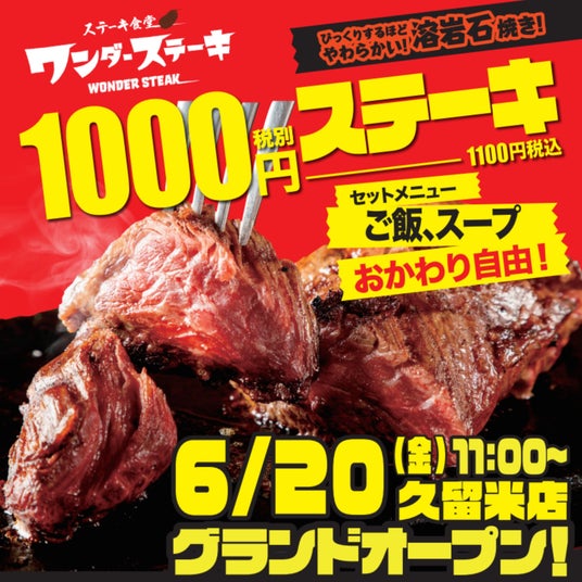 関西や関東を中心に店舗展開を進めている「ワンダーステーキ」が鳥栖店、福岡天拝坂店に続き、九州3号店目の出店。「ワンダーステーキ 久留米店(所在地:福岡県久留米市国分町1606-1)」が2025年6月20日(金)にグランドオープンします。