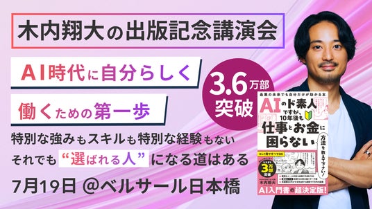 「日本をAI先進国に」を掲げAIのビジネス活用を学べる利用者数No.1※のAI大学「SHIFT AI」を運営する株式会社SHIFT AI(東京都渋谷区)代表取締役 木内翔大の書籍『AIのド素人ですが、10年後も仕事とお金に困らない方法を教えて下さい! 最悪の未来でも自分だけが助かる本』(KADOKAWA刊)の出版を記念し、2025年7月19日に東京・日本橋の「ベルサール日本橋」にて講演会を開催いたしました。