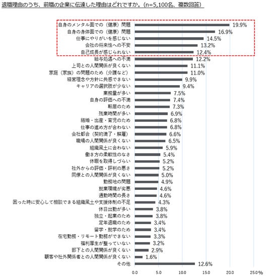 - 企業に伝えた退職理由は「自身のメンタル面・身体面での(健康)問題」が上位に