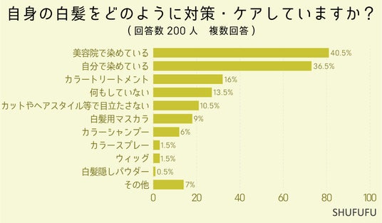 自身の白髪をどのように対策・ケアしているかを尋ねたところ、1位は「美容院で染めている(40.5%)」、2位「自分で染めている(36.5%)」となりました。1位・2位共に”染める”という回答になりました。染め方の種類はあるものの「染める」という方法が白髪対策としては最も一般的な対策となっているようです。