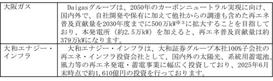 大阪ガスと大和エナジー・インフラは、本発電所の共同取得を皮切りに、引き続き再エネ発電所の取得および開発に取り組んでいきます。さらに、取得した発電所において、Daigasグループが有する再エネ発電所の運転・維持管理における豊富な実績や電力小売事業を基盤とする販売力、大和証券グループが有する金融力や再エネ発電所に関する技術力を活用し、バリューアップ※2と長期安定電源化を進めていきます。