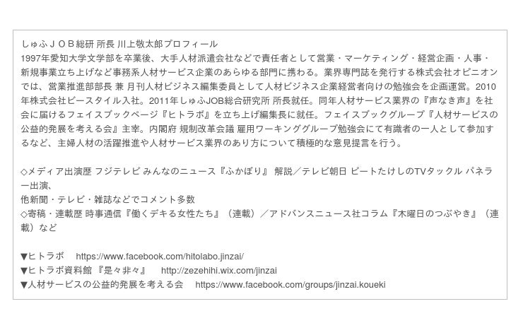 ■しゅふJOB総研 所長 川上敬太郎より