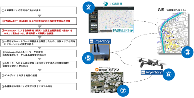 実証の流れは下図のフローをご参照ください(※今回は実証となりますので、作業の一部割愛など、災害時の実際の流れと異なる点もあります)。