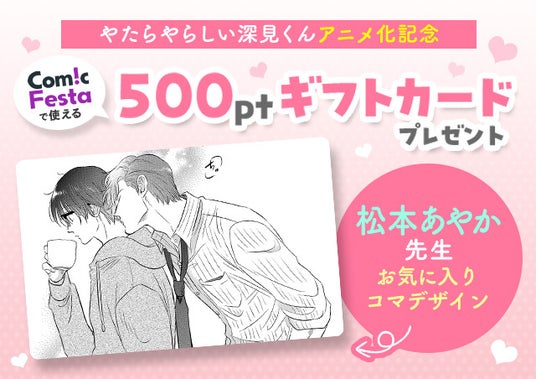 株式会社ウェイブ(本社:東京都豊島区、代表:関口航太)が運営する電子コミック配信サービス「ComicFesta(コミックフェスタ)」にて、大人気コミック「やたらやらしい深見くん」(著:松本あやか)のファンに向けた特別キャンペーンを実施いたします。本キャンペーンでは、松本あやか先生が厳選した名シーンがデザインされた、ComicFestaで使用できる500pt分のギフトカードを抽選で50名様にプレゼントいたします。