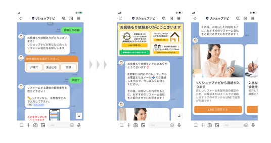 株式会社じげん様(以下、じげん)は、リフォーム費用・価格・料金の無料一括見積もりサイト「リショップナビ」を運営しています。クウゼン(KUZEN)を導入したLINE公式アカウント「リショップナビ」では、LINEからお客様が見積もりを依頼すると、担当者が電話やメールで詳細をヒアリングし、条件に合うリフォーム会社を選定します。その後、選ばれたリフォーム会社からお客様へ直接ご連絡が入ります。