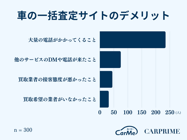 車の一括査定サイトのデメリットとしては、「大量の電話がかかってくること」と78.3%(235人)が回答し、圧倒的多数でした。