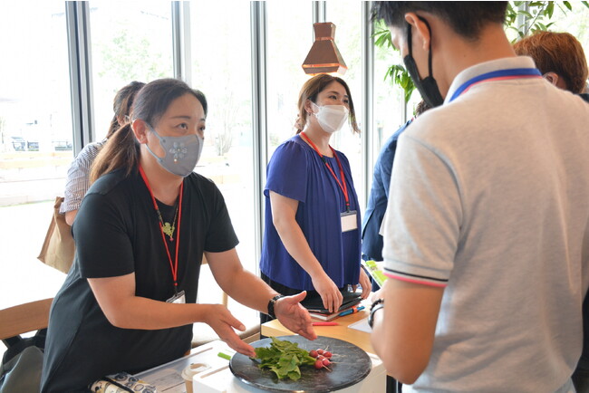 「ラディッシュは暑い季節は辛いので、油と一緒に食べるといい」「うちのイチゴは香りが強く、色が濃いのでスムージーもおすすめ」「小菊はツマモノのイメージが強いが、食材としても使ってほしい」などと、農産物のこだわりや特徴、おすすめの食べ方などを紹介しました。