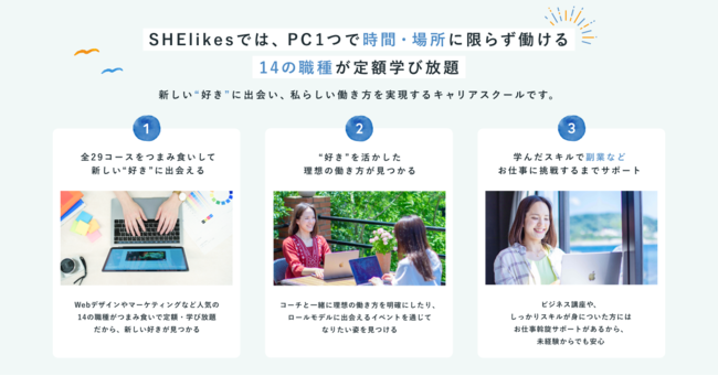 SHElikesは、Webデザイン・Webマーケティング・ライティングなどPC一つで働ける14の職種を幅広く学び、今の時代に求められるマルチクリエイターを育成して、時間や場所に縛られない賢く私らしい働き方を実現するためのキャリアスクールコミュニティです。