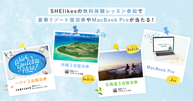累計6万人が受講する女性向けキャリアスクール「SHElikes(シーライクス)」をはじめ、ミレニアル世代向けコミュニティブランドを展開するSHE株式会社(本社:東京都港区、代表取締役CEO/CCO:福田恵里、以下SHE)は、7月7日(木)より夏の特別キャンペーンを開始します。女性向けキャリアスクール「SHElikes(シーライクス)」の無料体験レッスン参加で、星野リゾート宿泊券やMacBook Proなどの豪華賞品が当たるキャンペーンを実施します。