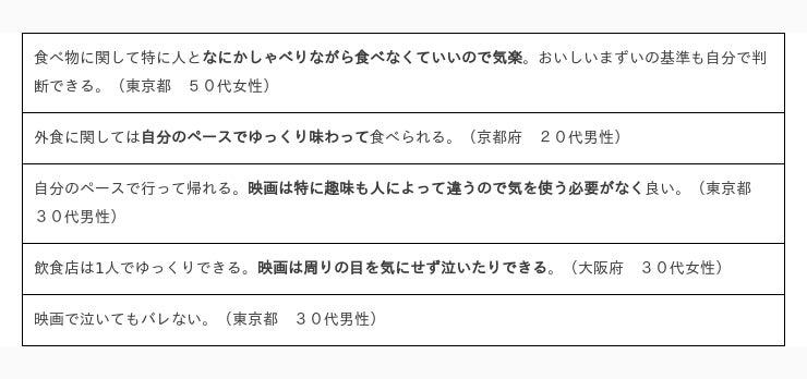 おひとり様の魅力について、「自分のペースで楽しめる」「人に気を使わないでよい」という声が多数でした。他人に気を使わずに、自分ための有意義な時間を過ごすことがおひとり様行動の醍醐味といえそうです。