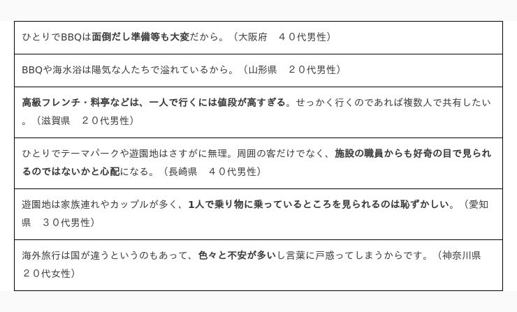 大人数で楽しむことを前提としているレジャーは、「おひとり様でするには寂しい」「準備が大変」「人の目が気になる』と思う人が多いようです。