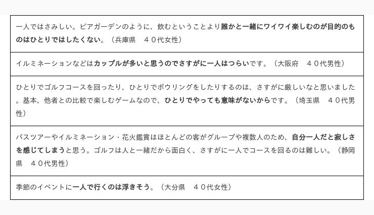 また、「おひとり様女子の引いてしまう行動」のコメントと同様に、「大勢で楽しむ行動」をあえておひとり様で楽しむ様子を、「かわいそう」「寂しそう」と感じ、引いてしまう人が多いようです。