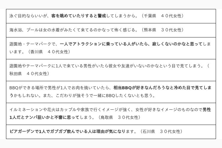 男性は、「海水浴」「プール」など水着になる可能性が高い場所でのおひとり様行動が引かれる可能性が高いようです。