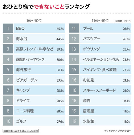 次に、「おひとり様でできないこと」について聞いてみました。1位は「BBQ」で65.2%、2位は「海水浴」で44.5%、3位が「高級フレンチ・料亭など」で39.2%となりました。